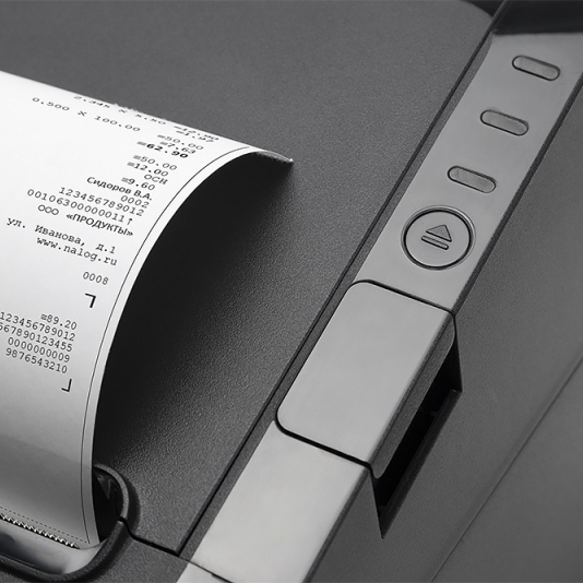 Заменить чековую ленту легко — одно нажатие кнопки и подпружиненная крышка откроется полностью, без риска травмы пальцев кассира. АТОЛ 27Ф удобен для кассовой зоны самообслуживания за счет рулонной подачи чековой ленты.